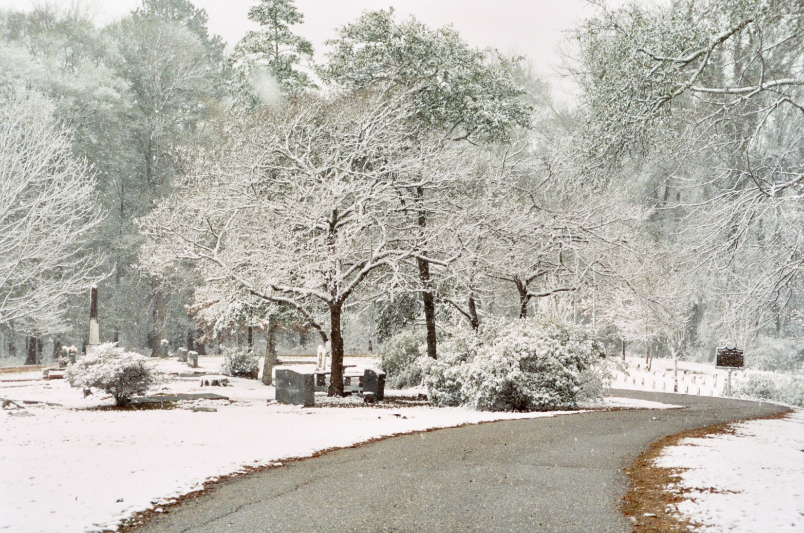 Snow covered cemetery