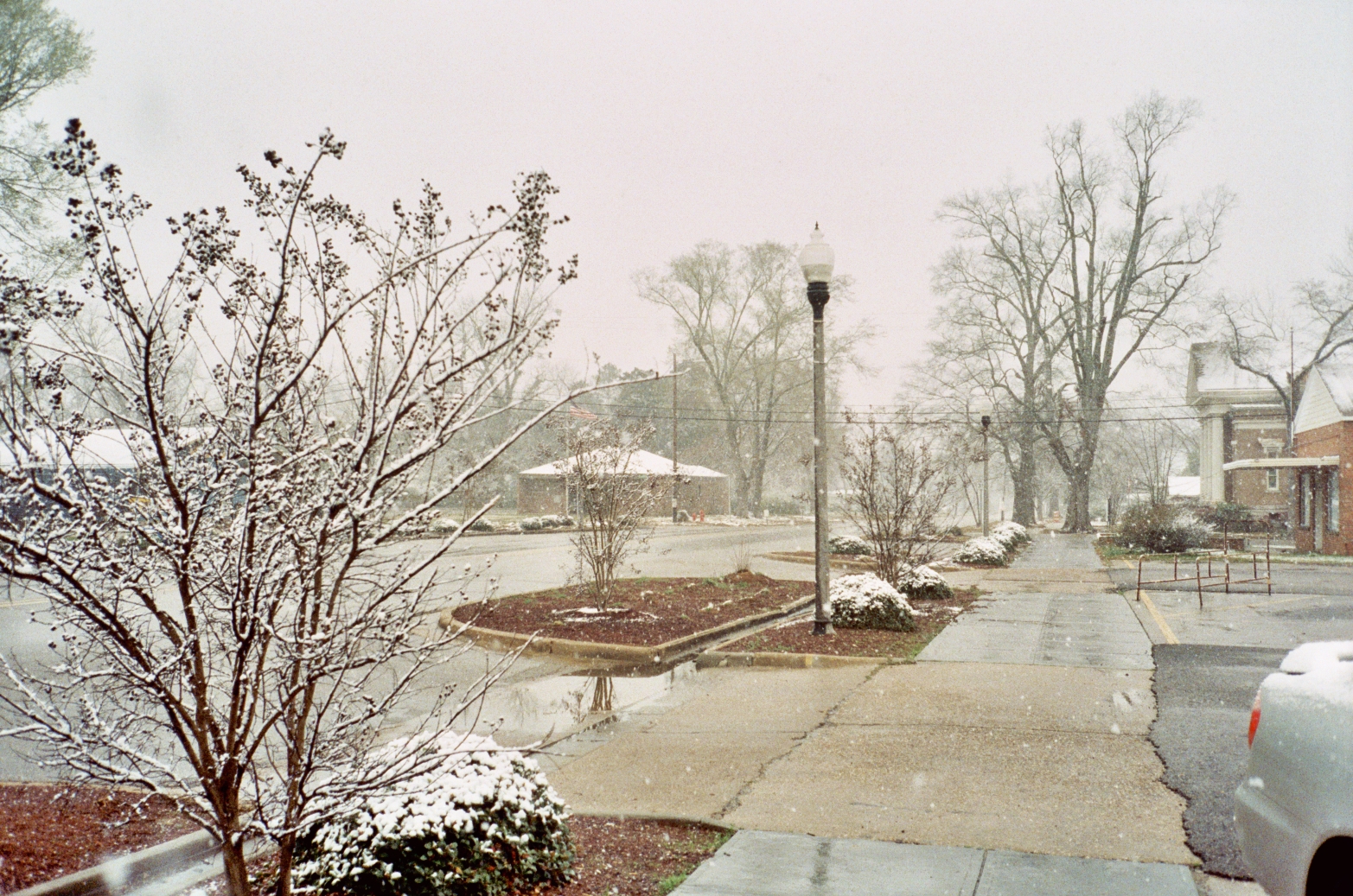 Street lined with trees and shrubs dusted in snow