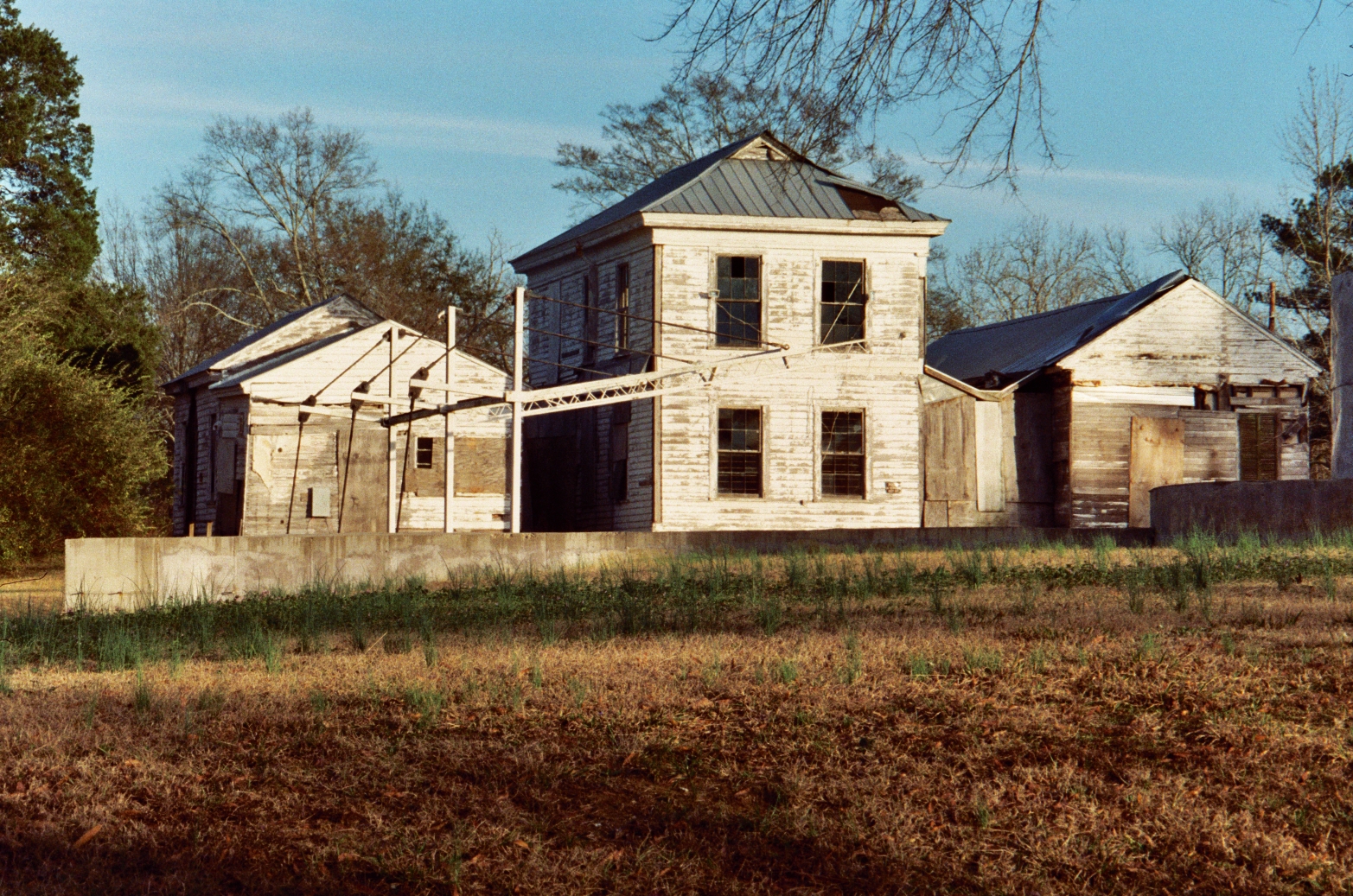 Side view of Bodark Amphitheater with an abandoned building in background