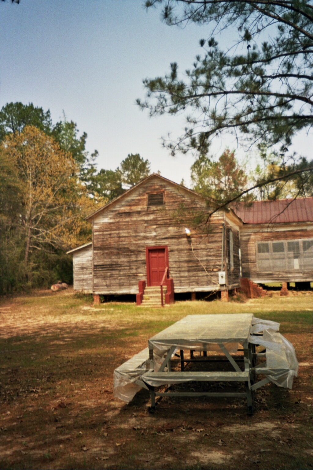 Picnic table outside a wooden building