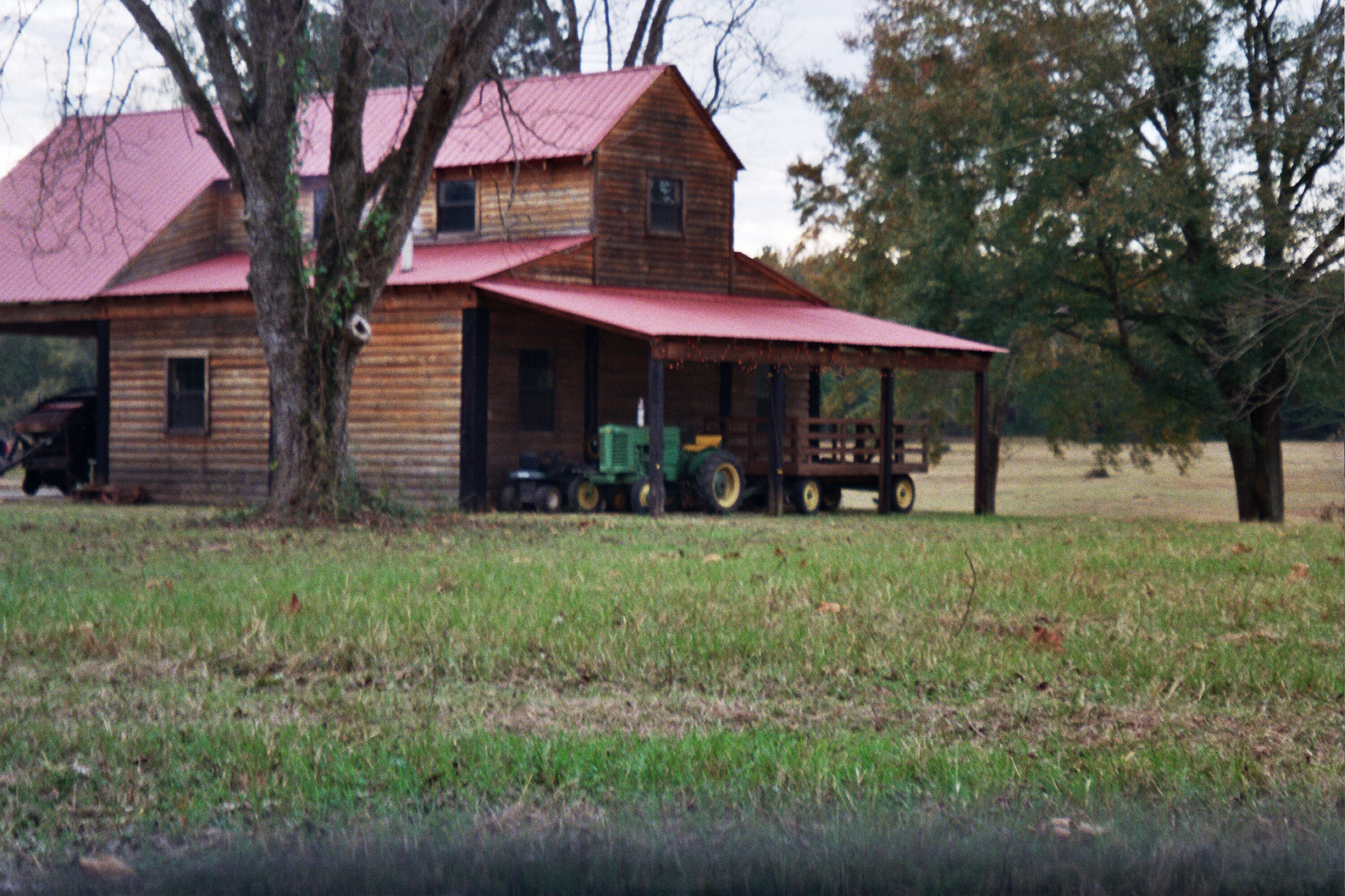Tractor by a building
